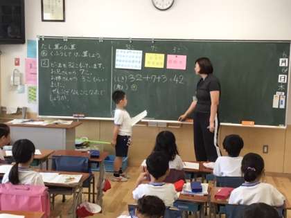 算数の時間です。3つの数をどうやってたし算するか、一人一人で考えた後、意見を交流しています。