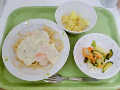献立 チキンクリームソーススパゲッティ、茎わかめサラダ、コーンポテト、牛乳