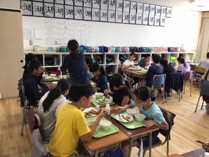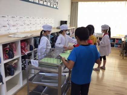 今日の給食は、いわしのかば焼き、かきたまみそ汁などです。いっぱい食べてね。
