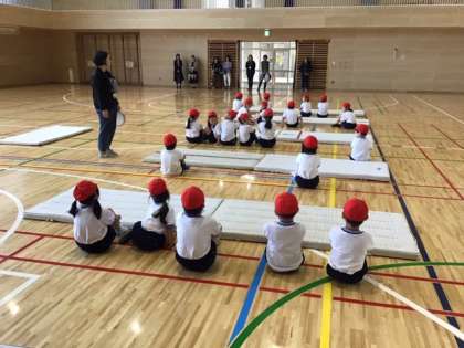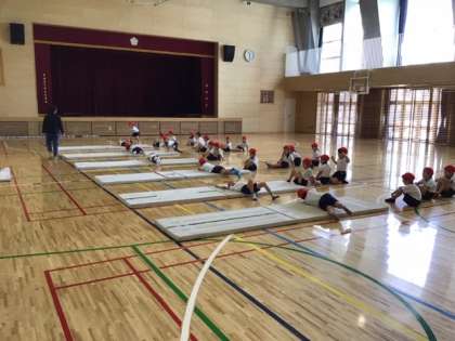 マットあそびをしています。小さいころから、いろいろな動きを経験することが大事です。