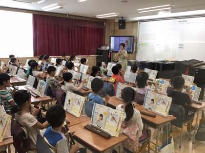 音楽の時間です。今日は、きれいな音でリコーダーを吹けるようにがんばっています。