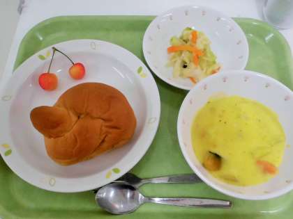 献立 黒砂糖パン、かぼちゃのクリームシチュー、野菜のドレッシングかけ、さくらんぼ、牛乳