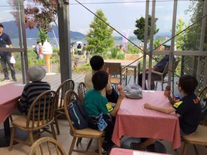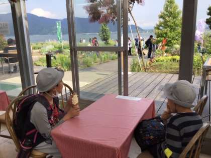 富士山の見えるキッチンで、とってもおいしいソフトクリームを食べています。