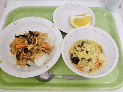 献立 切干大根入りスタミナ丼、卵とわかめのスープ、河内晩柑、牛乳