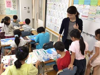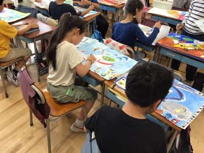 図工では、とてもカラフルな乗り物を描いています。色づかいがイキイキしていますね。