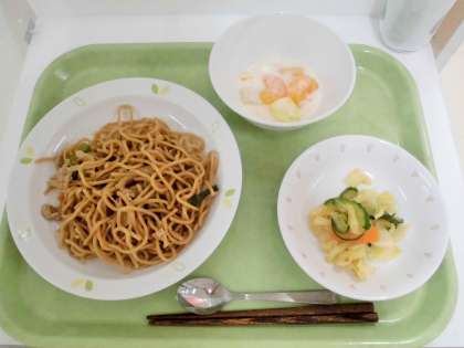 献立 塩焼きそば、キャベツときゅうりのキムチ風、フルーツヨーグルト、牛乳