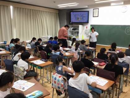 外国語活動の時間です。今日は、「I like〜」を中心にレッスンしています。