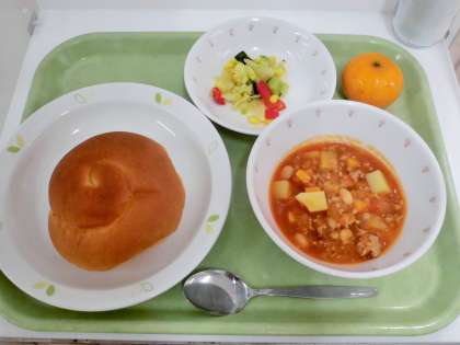 献立 ミルクパン、チリコンカン、チョップドサラダ、冷凍みかん、牛乳