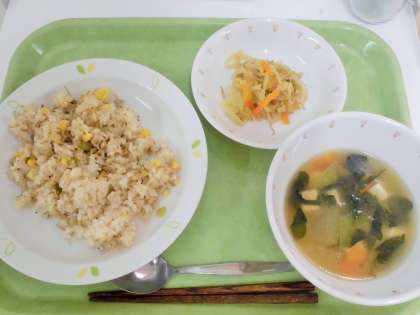 献立 卵とじゃこのチャーハン、野菜のピリ辛和え、冬瓜スープ、牛乳