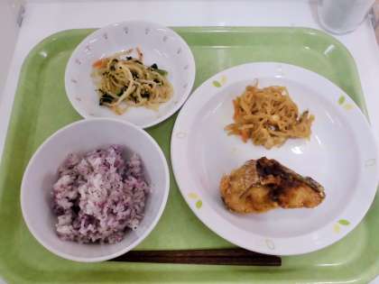 献立 ゆかりご飯、あじの南蛮漬け、切干大根の煮付け、野菜のごまだれかけ、牛乳