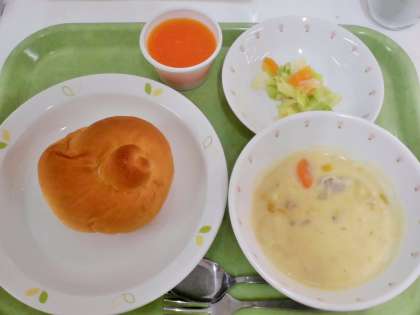 献立 ミルクパン、米粉のコーンシチュー、キャベツサラダ、キャロットゼリー、牛乳
