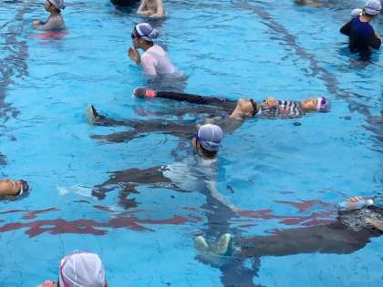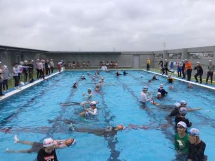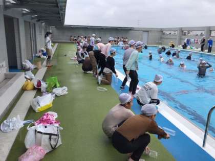 今日は、高学年が着衣泳にチャレンジしています。実際に経験しておくことが、とても大事ですね。