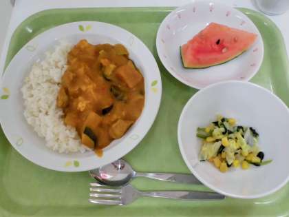 献立 夏野菜カレーライス、コーンサラダ、小玉すいか、ドリンクヨーグルト