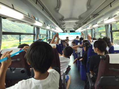 バスレクが続いています。紙テープを早く送るゲームで、盛り上がっています。
