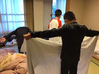 布団を畳んだり、健康観察をしたり、朝の準備が進んでいます。