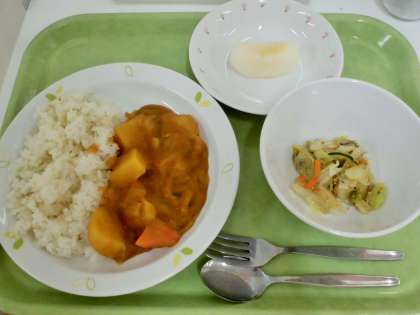 献立 チキンカレーライス、じゃこサラダ、梨、牛乳
