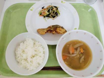 献立 ご飯、白身魚のオニオンソース、野菜のごまじょうゆ和え、五目みそ汁、牛乳