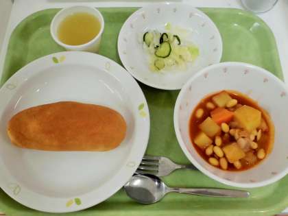 献立 米粉パン、ポークビーンズ、キャベツサラダ、パイナップルゼリー、牛乳