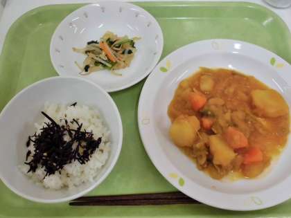 献立 ご飯、ひじきふりかけ、韓国風肉じゃが、もやしの和え物、牛乳