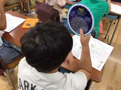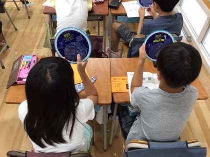 明日は、センター移動教室です。プラネタリウムと英語体験をします。今日は、星座早見盤を使う練習をしています。