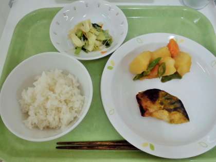 献立 ご飯、さばのタンドリー風、じゃが芋の炒め煮、小松菜サラダ、牛乳