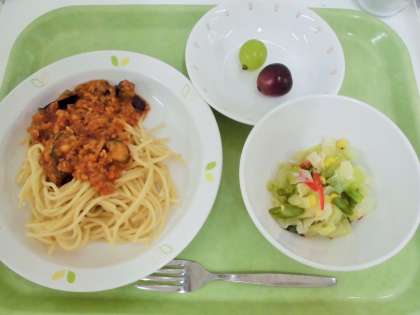 献立 なす入りミートソーススパゲッティ、ハニーマスタードサラダ、ぶどう2種類、牛乳