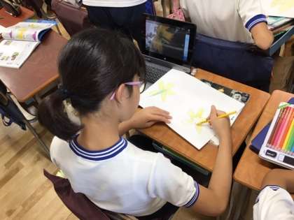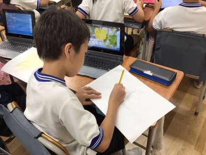 理科の時間です。タブレットPCを活用して、花を細かく観察します。