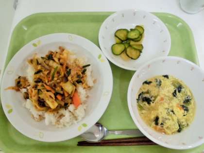献立 豚キムチ丼、きゅうりの南蛮漬け、卵スープ、牛乳