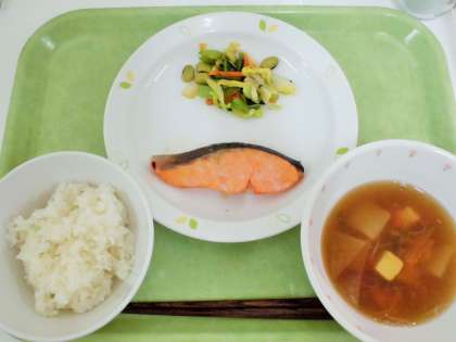 献立 ご飯、鮭の焼きづけ、青大豆入りお浸し、のっぺい汁、牛乳