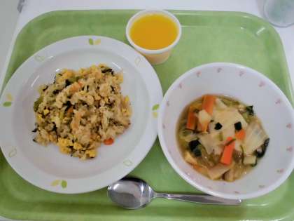 献立 高菜チャーハン、わんたんスープ、みかんゼリー、牛乳