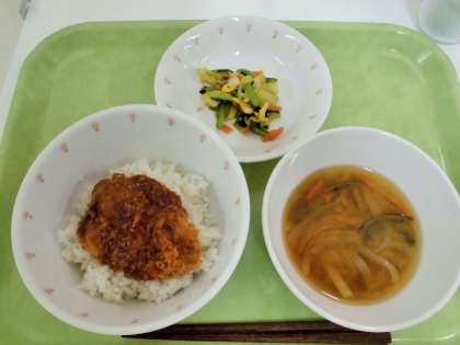献立 たれかつ丼、白菜のお浸し、五目みそ汁、牛乳