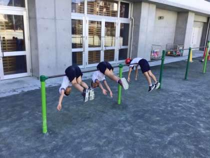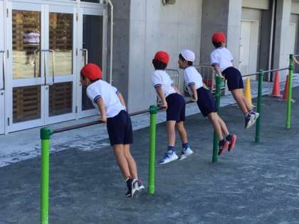 鉄棒の学習です。布団干しやつばめに挑戦しています。