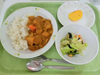 献立 秋のカレーライス、ひよこ豆入りゆで野菜、柿、牛乳