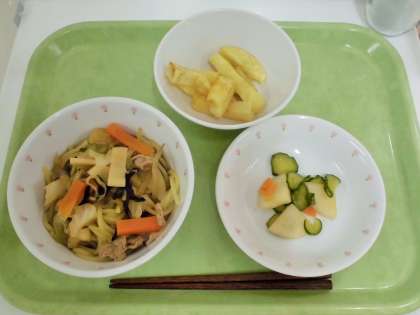 献立 長崎ちゃんぽん、スパイシーポテト、かぶときゅうりの中華サラダ、牛乳