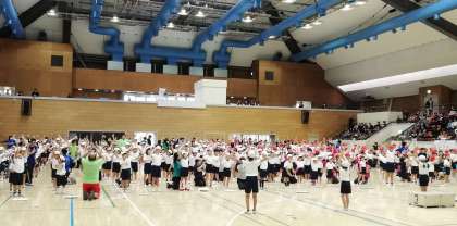 世田谷区立総合運動場体育館で、特別支援学級連合運動会が開催されました。くるみ学級の子どもたちは、とても並ぶのがきれいです。はじめのたいそうです。