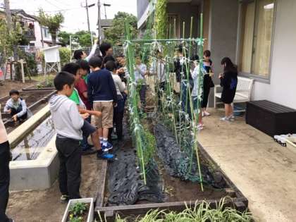 栽培委員会のみなさんが、あさがおの種を集めています。