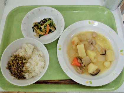 献立 ご飯、じゃこふりかけ、鶏じゃが、ほうれん草のだしじょうゆ和え、牛乳