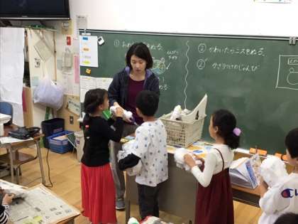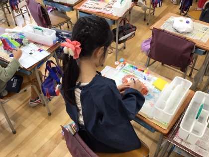 図工の時間です。お面づくりに取り組んでいます。お面の形ができた後は、色ぬりに進みます。