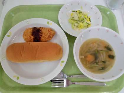 献立 黒砂糖パン、メルルーサフライ、コーン入りフレンチサラダ、せん切り野菜スープ、牛乳