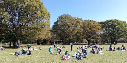 たくさん秋探しをした後は、楽しみにしていたお昼ごはんです。気持ちよい青空のもと、広々と芝生の上で、班ごとに集まって食べました。