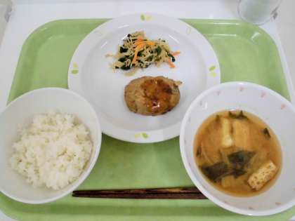 献立 ご飯、野菜ハンバーグ、かみかみサラダ、玉ねぎとわかめのみそ汁、牛乳