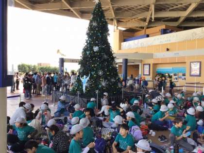 お弁当タイムです。大きなクリスマスツリーの側でのんびりお弁当を食べています。