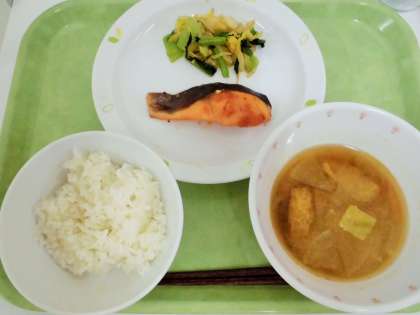 献立 ご飯、鮭のもみじ焼き、白菜のお浸し、さつま汁、牛乳