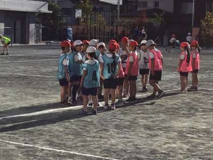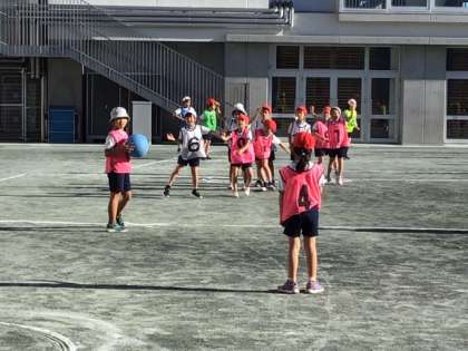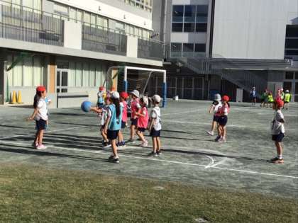 体育では、「パスゲーム」に取り組んでいます。パスをしながらシュートにつなげます。