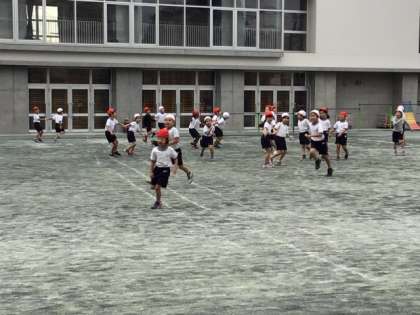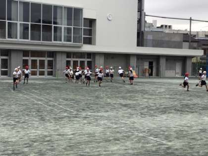 1時間目は体育の時間です。鬼あそびで元気に体を動かしています。