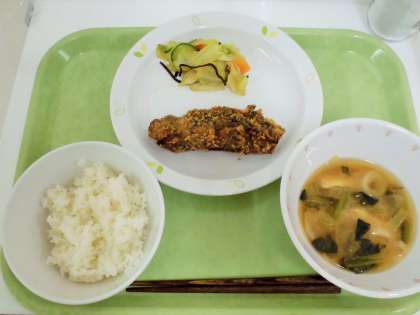献立 ご飯、白身魚のごまフライ、昆布キャベツ、大根と小松菜のみそ汁、牛乳