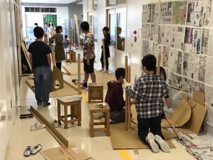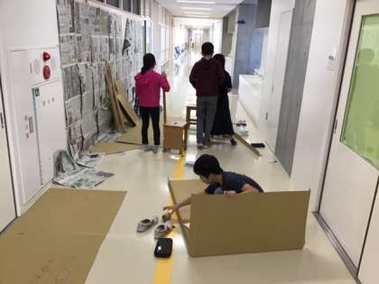 図工では、学年制作にも挑戦しています。「ダンボールで茶室」を作ります。