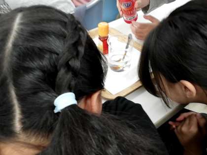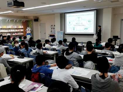花王の工場の研修室で、環境のためにどんな工夫をしているかなどの説明を受けました。子どもたちは、たくさんのメモを取っています。また、実験のコーナーもあり、洗剤の働きを調べました。