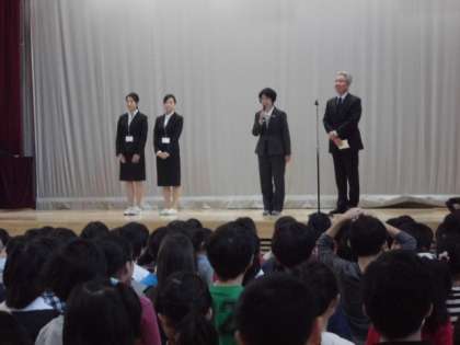 今朝は校長先生から新しい先生と、栄養士を目指す教育実習生の紹介がありました。