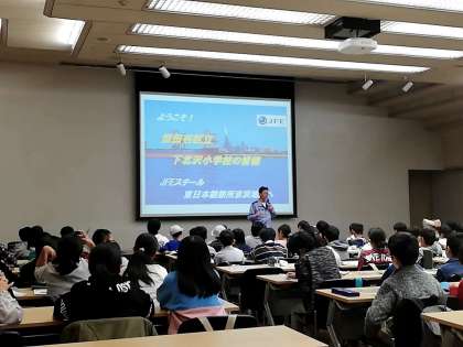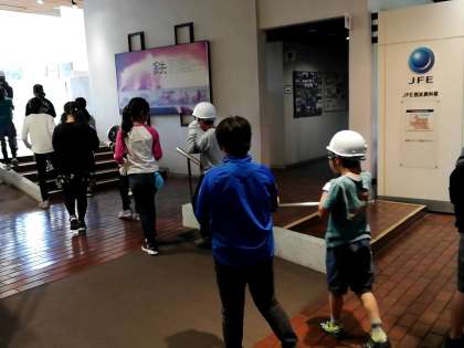 JFEスチールへ到着しました。前半は、スライドで工場の概要を教えていただきました。後半は、バスに乗って工場内をめぐります。ここでも工場内は撮影禁止です。ヘルメットを被って見学をしました。厚い鉄の板を圧縮する工場はバスから降りて見学しました。炉から出てきたばかりの1100度に熱せられた鋼板はオレンジ色になって遠くから見ているところまで、高熱が伝わってきました。音と熱と匂いなど、身体中で感じてきました。
